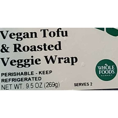 Whole Foods Market Vegan Tofu & Roasted Veggie Wrap (4.75 oz) contains 28g total carbs, 26g net carbs, 8g fat, 6g protein, and 200 calories.