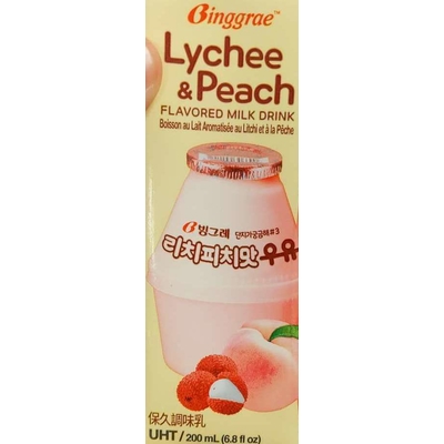 Binggrae Flavored Milk Drink, Lychee & Peach (1 carton) contains 24g total carbs, 24g net carbs, 5g fat, 5g protein, and 160 calories.