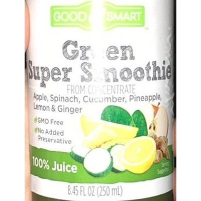Good & Smart Green Super Smoothie (1 bottle) contains 30g total carbs, 28g net carbs, 0g fat, 0.5g protein, and 120 calories.