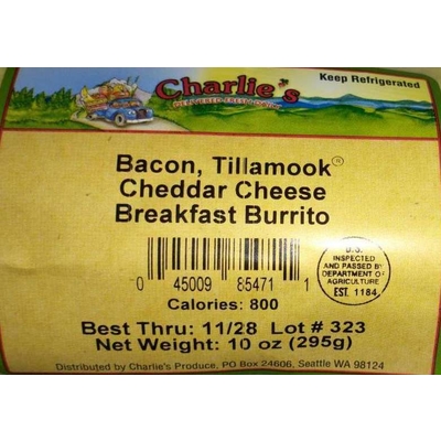 Charlie's Bacon, Tillamook, Cheddar Cheese Breakfast Burrito (10 oz) contains 57g total carbs, 55g net carbs, 47g fat, 36g protein, and 800 calories.