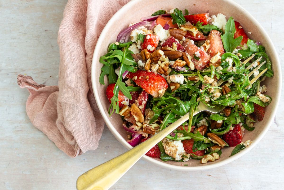 Clean the strawberries and remove the stalks. Quarter the strawberries and add to a salad/serving bowl along with the arugula. Thinly slice the onion and add to the bowl. Crumble the feta cheese into the bowl. Mix well to combine.Step 2