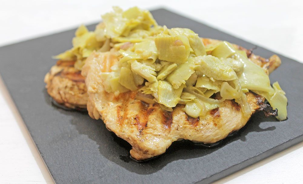 These simple butterflied chicken breasts are topped with buttery pan fried artichokes, shallot, garlic and a hint of lemon.
