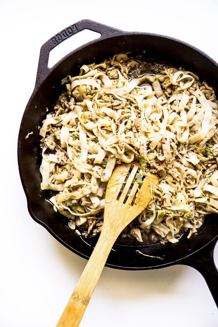 Add the ground pork and let it cook on one side for at least 3-4 minutes to allow the meat to brown before touching it. Then stir it around and cook until cooked there is no more pink. Add in the pale parts of the green onion and ginger. Add the cabbage and noodles in.Step 4