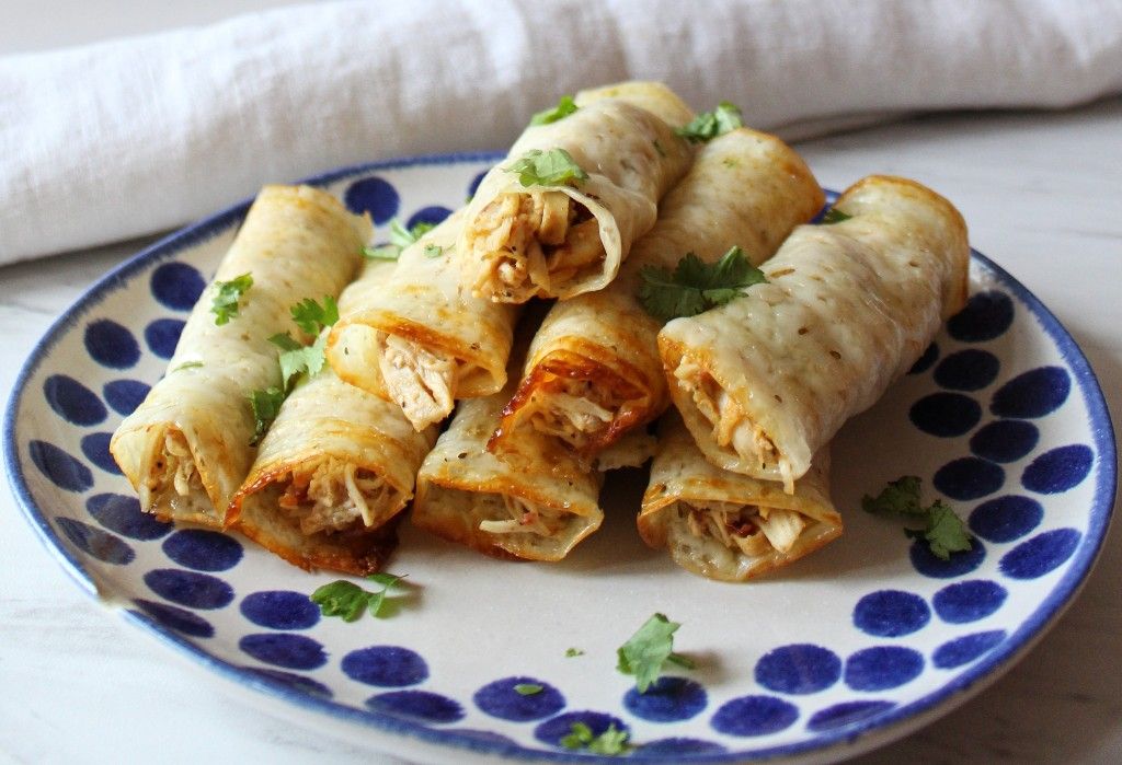 You don’t have to be perfect, but rolling these Keto taquitos requires a pinch of skill. Since the “tortillas” are made from melted cheese, you have to work a little quickly when filling and rolling them. For the easiest time, have your shredded chicken filling and a spoon ready to go at the side of your oven. This way, you can arrange the filling immediately as the mozzarella cheese slices cool. Use a spatula or a flat utensil to lift the edges of the melted cheese for rolling, if you have sensitive fingertips. At the end of rolling, you can pat away any excess grease with a paper towel so you don’t make a mess while eating.