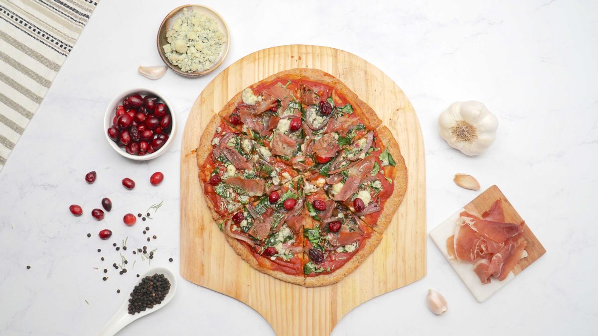 This festive keto pizza is the ultimate treat for sharing. The base is formed of a fathead dough and the pizza is topped with rich and aromatic seasonal ingredients.