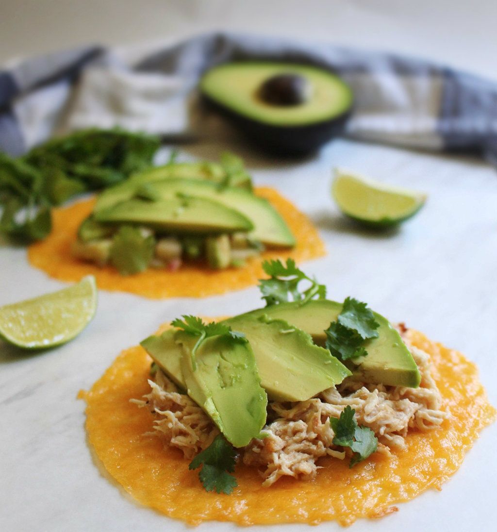 Keto Cheese Crisps can come in handy for a lot of recipes! Shredded cheddar cheese can be baked into yummy tostada chips. These are perfect for piling up your favorite Mexican-inspired ingredients. This recipe includes seasoned pulled chicken, fresh avocado, and cilantro. You can add other toppings at your discretion, such as Mexican chorizo, jalapeno, sour cream, or queso fresco.