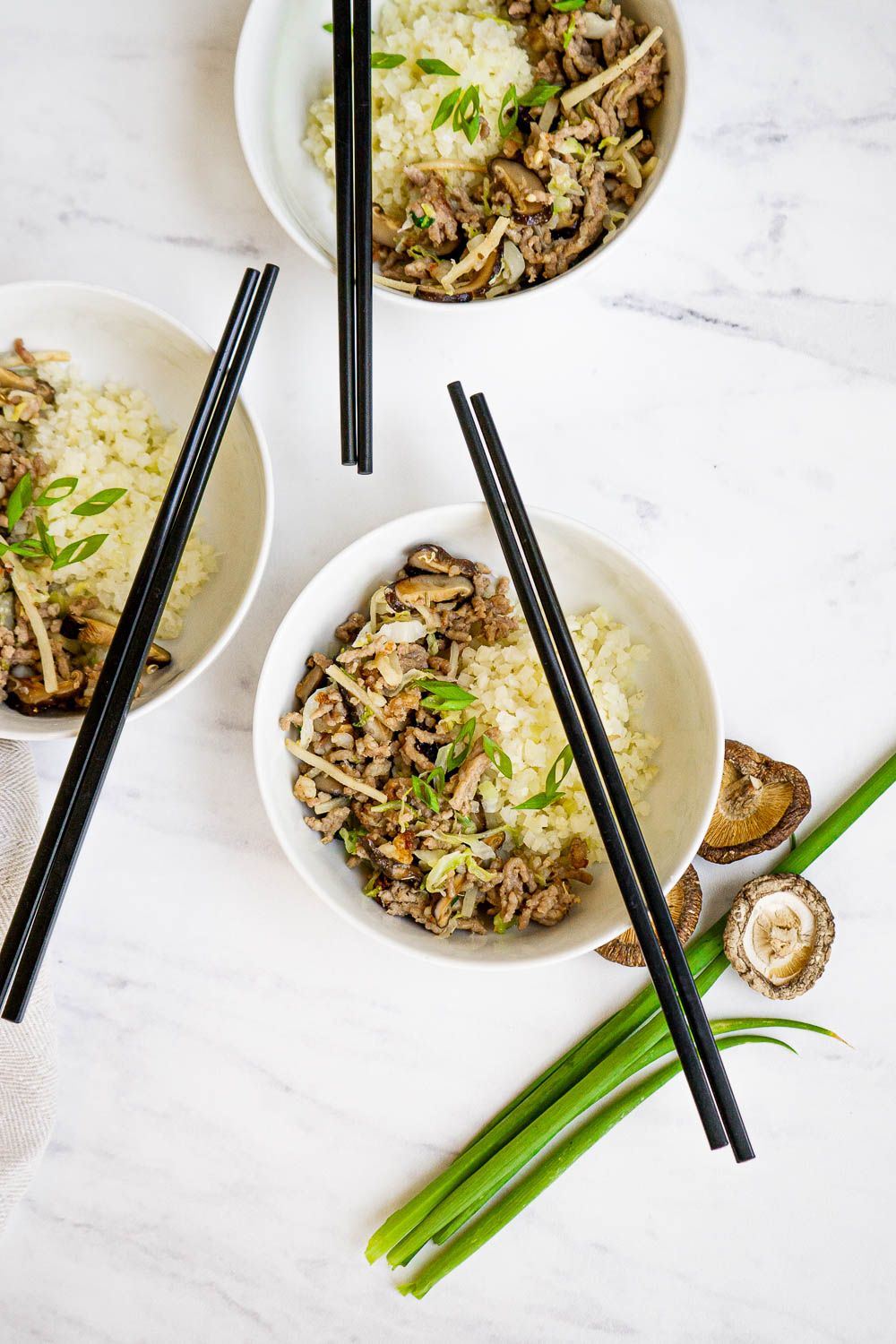 This low carb and Keto egg roll filling is made just like a traditional egg roll recipe. Tender, ground pork is stir-fried with chopped succulent shrimp, savory shiitake mushrooms, cabbage, julienned bamboo shoots, and sliced scallions. The entire mixture is seasoned with lovely five-spice powder, white pepper, and plenty of salt. The trick to this recipe is to boil the cabbage and hand-squeeze all the water out of it. It takes some extra work, but the hard work pays off (no liquid water throughout the dish!) The result is a flavorful mixture with a beautiful texture (not soggy at all). Use this filling to stuff lettuce wraps or top cauliflower rice.