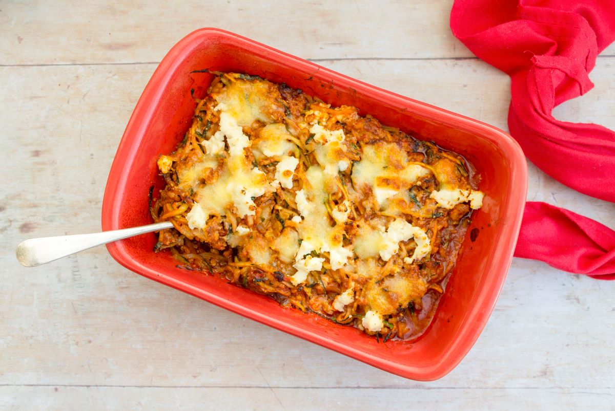 This keto take on ziti is packed with flavor from layers of ground pork, tender onion, zucchini noodles, creamy ricotta, oozy mozzarella and parmesan.