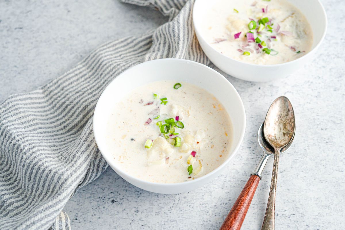 If you are looking for more easy ways to add fish to your diet, this recipe for Keto Slow Cooker Fish Chowder is an excellent choice. White onion and olive oil start the base of this chowder, along with heavy cream and some water to make it broth-like. Wild-caught cod is added to the slower cooker along with spices and seasonings like salt, black pepper, and paprika. Since non-Keto recipes for fish chowder call for potatoes, we have added cauliflower florets instead. To make the cauliflower more "potato"-like, we have cut them into larger pieces, so they don't dissolve into the chowder, but are the perfect texture by the time the soup is finished cooking. The soup is topped with a delicious mixture of diced celery, red onion, and sliced fresh scallions. This gives the soup a nicely needed pop of color and texture. You will love this Keto slow cooker recipe!
