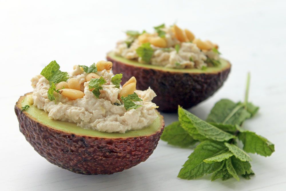 These flavorsome avocado boats are loaded with creamy yogurt, rich tahini, shredded chicken, aromatic mint, and topped with crunchy pine nuts.