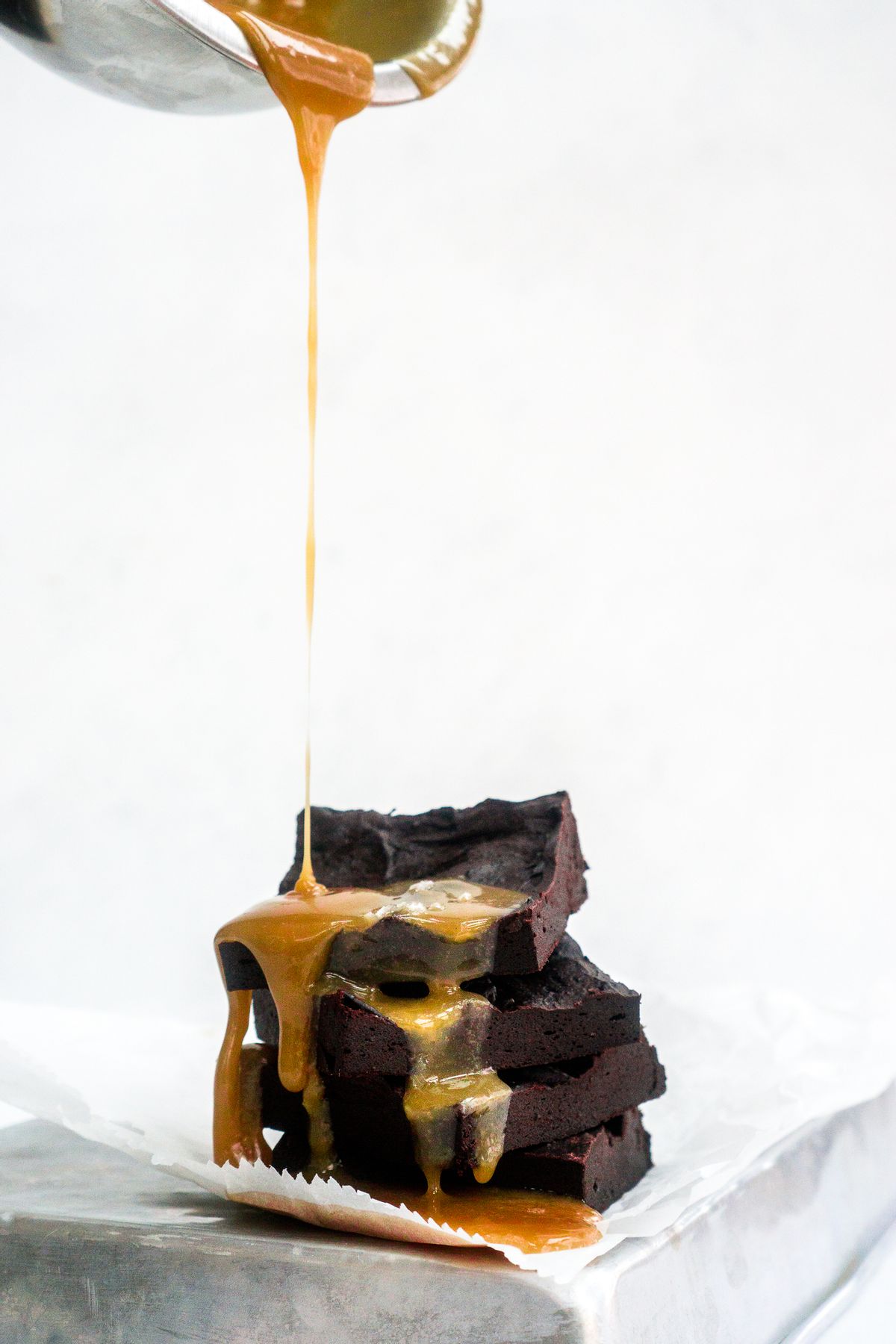In the meantime, in a small saucepan, combine the butter, cream, sea salt and brown sugar to make the caramel. Bring to a low boil and allow to boil for 1-2 minutes whisking constantly. You will see the mixture turn from opaque to translucent. Place the caramel in the fridge to thicken. It is thick enough when it coats the back of a spoon and a line drawn into the back of the spoon does not run back together. Drizzle over brownies and sprinkle brownies with additional sea salt.