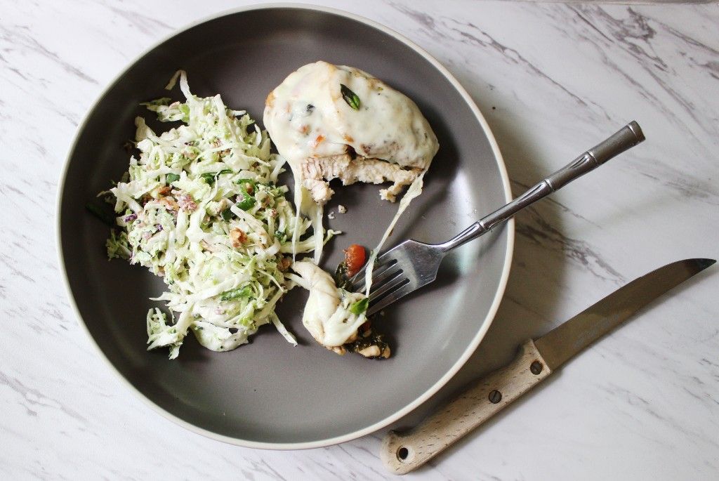 If you’d like to use this recipe for your meal prepping, you may need to keep the bruschetta chicken and the coleslaw separate from each other. If you’re bringing this meal away from your home, keep the chicken in its own container so you can microwave it. If you’re keeping this meal at home, just keep all the completed coleslaw stored together in a tupperware so you can take what you need when you put your meal together. The coleslaw stays fresh for up to 3 days and the chicken stays fresh for up to 5 days.