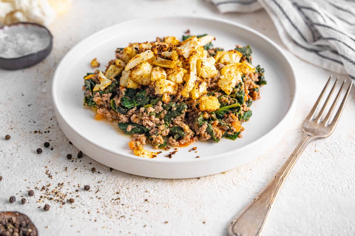 Absolutely! This simple 5:2 diet dinner recipe can be made ahead of time to be enjoyed throughout the week. To meal prep, simply prepare the recipe according to the instructions. Then, allow the ground beef to completely cool down before transferring it to an airtight container. Store the ground beef in the refrigerator for up to a week. Similarly, bake the cauliflower and store the cooled cauliflower in an airtight container in the refrigerator for 3 to 5 days. Before eating, plate the food and warm it in the microwave for about 30 seconds or on the stovetop over medium heat.