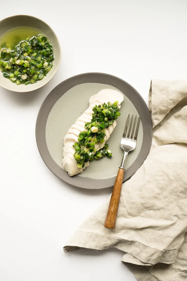 Poaching chicken is a simple, way to product moist, tender meat. I like to pair chicken like this with a salty, scallion oil which is very easy to make and almost requires no cooking. All it takes are a few chopped scallions with some hot oil poured over them. Use this to top any protein, but it is delicious on chicken!