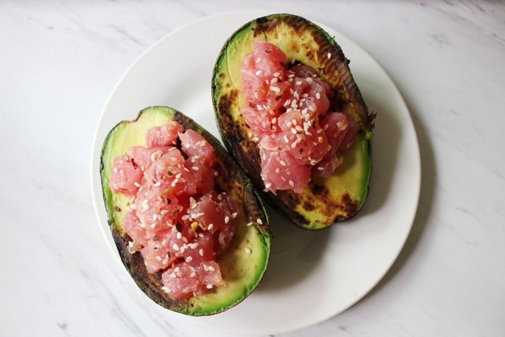 Fresh tuna poke is packed inside a large avocado that’s been grilled over your stovetop. You have the perfect combo of hot and cool, mild and salty, with a hint of ginger and vinegar. You can top with your favorite poke toppings at your discretion, such as extra sesame seeds, sriracha, spicy mayo, chili flakes, pickled cucumbers, kimchi, nori seaweed, etc.