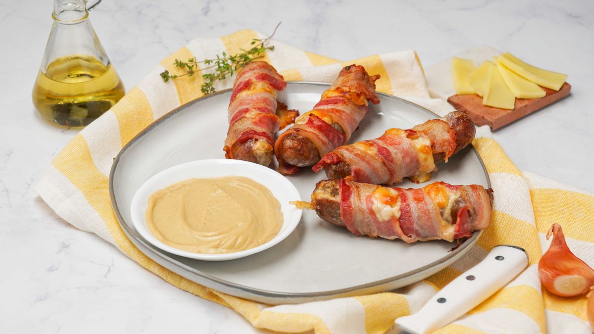 Packed with cheese, mustard and a hint of shallot, these sausages are tightly wrapped in bacon before baking.