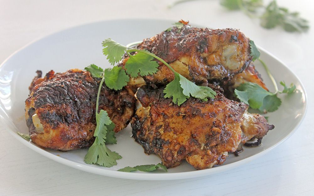 Transfer the chicken thighs to an oven tray and bake for 15 minutes until golden brown all over. Remove and spoon over the remaining marinade and bake for a further 10 minutes or until the chicken is caramelised and completely cooked through.