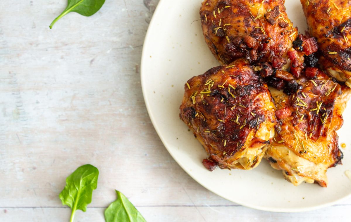 These delicious Keto chicken thighs are basted in a sweet marinade before being oven baked until perfectly crisp and golden. Our low carb dinner recipe is prepared with skin-on, bone-in chicken thighs, olive oil, maple-flavored syrup, lemon juice, aromatic dried rosemary and thyme, a little garlic powder, and diced pancetta. This makes a great Keto protein option served with your preferred low carb sides.