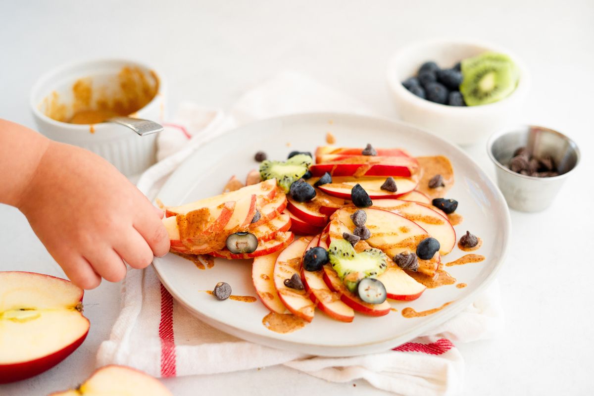 Here is a fun way to help your kids get in an extra serving of fruits and healthy fats. A sweet and tart apple sliced very thin and plated, shingled to serve as the “nachos.” Almond butter is mixed with melted coconut oil to make the nut butter beautiful and drizzly (plus, it never hurts to have an extra dose of MCTs!). Once the apples are plated and drizzled with the almond butter, they are garnished with sliced blueberries, sugar-free chocolate chips, and kiwis made into heart shapes. Your kids will have fun decorating the “nachos” and have a great time eating it too.