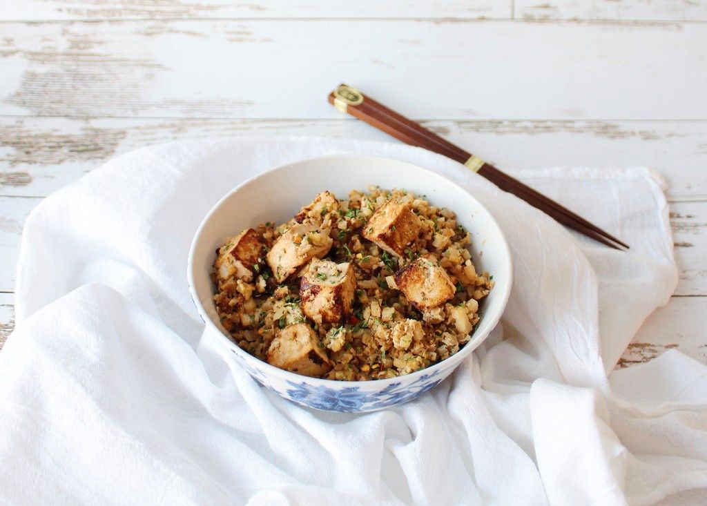 You’ll find this Keto Chinese recipe light yet satiating. Fried cauliflower rice is lightly seasoned and made with scrambled egg. Whole cubes of extra firm tofu are marinated and then fried in sesame oil before being placed on top of the fried rice. It’s a Keto twist on classic Chinese flavors! This is a great recipe to use for meal prepping or as a part of an OMAD meal. This is also an easy recipe to alter, make substitutions, or build for your personal preference and diet. Garnish your crispy tofu fried rice with chopped green onion, sesame seeds, red pepper flakes, or Furikake seasoning.