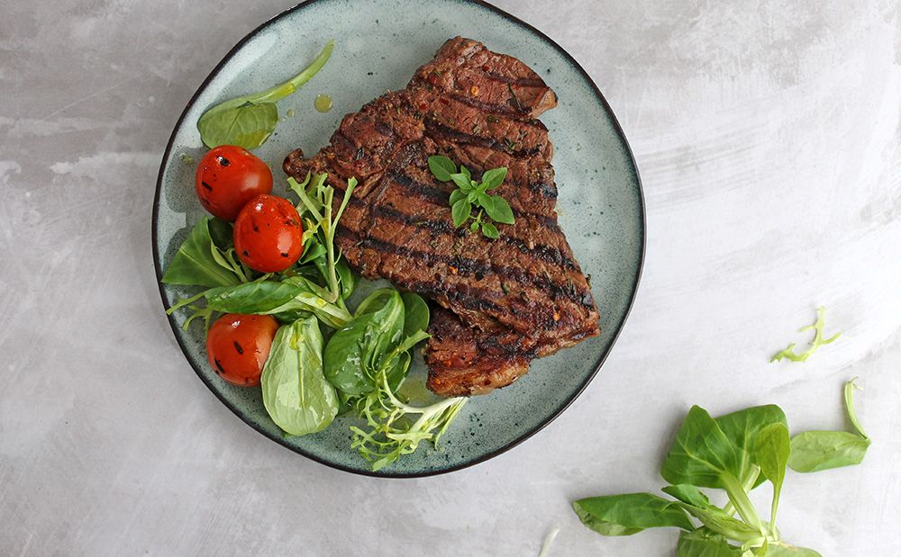 This keto steak is marinated in aromatic seasonings before being cooked to taste and served with griddled cherry tomatoes.