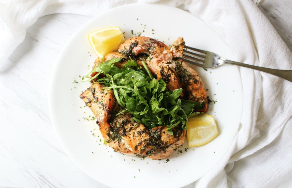 Serve with lemon wedges for squeezing or a favorite keto dipping sauce. Enjoy between 2 people by using forks to pull off pieces of salmon. You may also cut and divide the salmon evenly with the arugula and spinach.