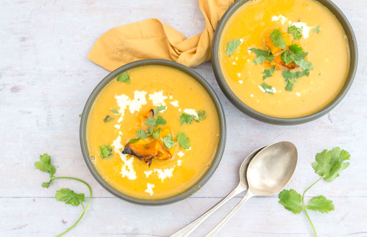 Roughly chop the reserved squash pieces. Stir the heavy cream through the soup and divide into four serving bowls. Top the soup with the squash pieces and scatter with freshly chopped cilantro to serve.