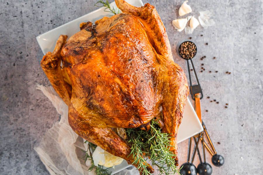 The recipe is based on a 15# turkey. Feel free to use any sized turkey 土5 pounds. The length of cook time is roughly 15 minutes per pound. However, this number can greatly vary depending on a number of factors. It is best to take the turkey’s temperature in the thickest parts using a meat thermometer (in the breast of the thigh) until the temperature reaches 160-165 F.