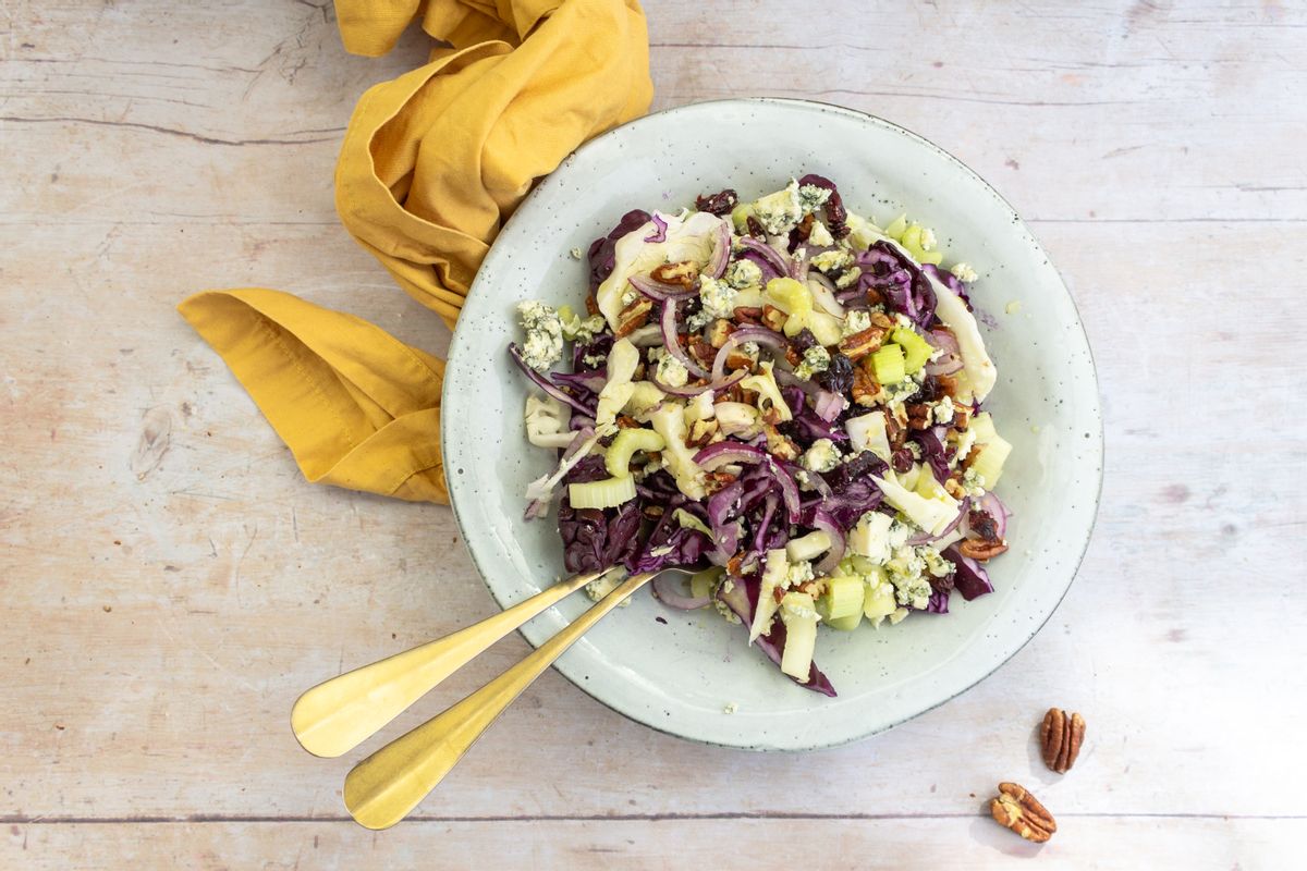 Finely chop the cranberries and roughly chop the pecans and celery. Scatter the cranberries, celery and pecans over the salad. Crumble over the blue cheese. Gently mix everything to combine.Step 3