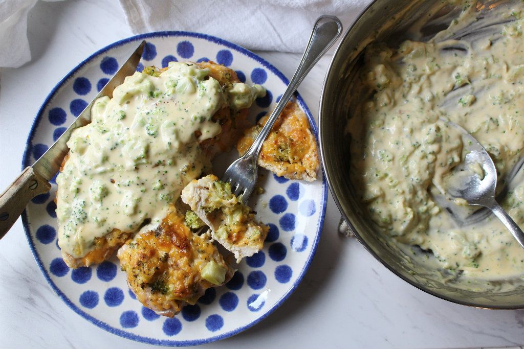 While the chicken is baking, make the broccoli cheddar sauce. In a pan, combine the cream with the second half of chopped broccoli. Heat on low heat until a low simmer starts.Step 6