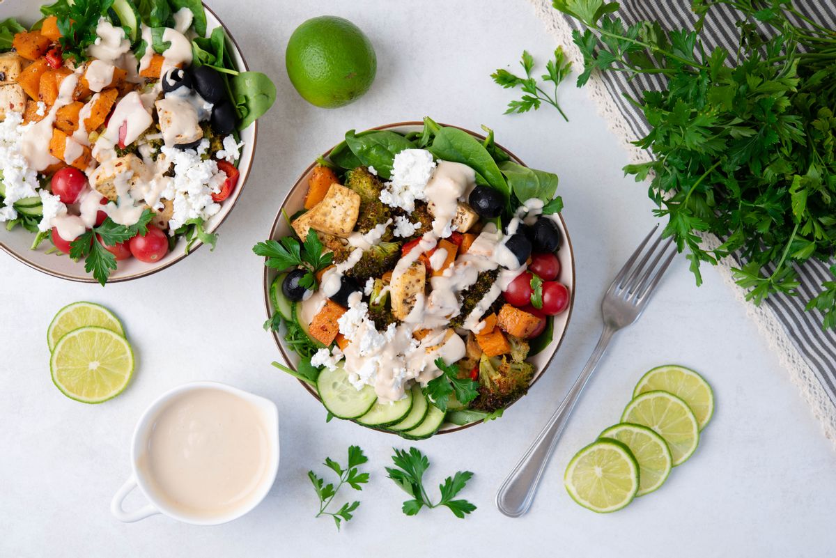 Low Carb Mediterranean Sweet Potato and Tofu Bowl
