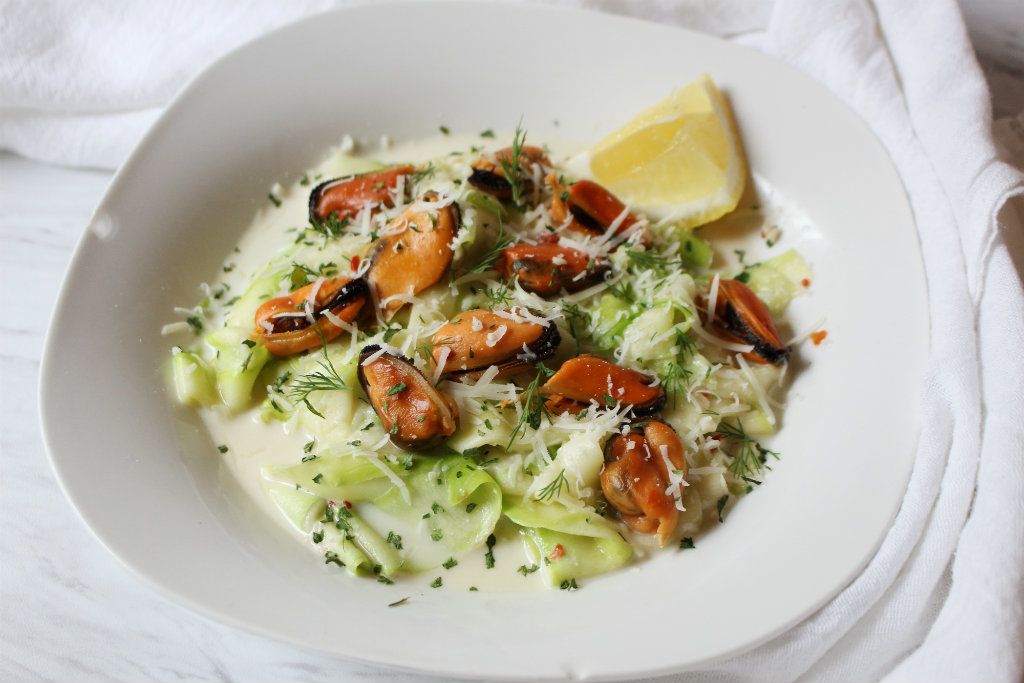 Serve your zucchini noodles with the cream sauce and your mussels. The final serving weight of this recipe includes the mussels WITHOUT their shells. You can garnish your dish with your favorite herbs. This one was garnished with parsley, dill, extra parmesan, and a wedge of lemon.