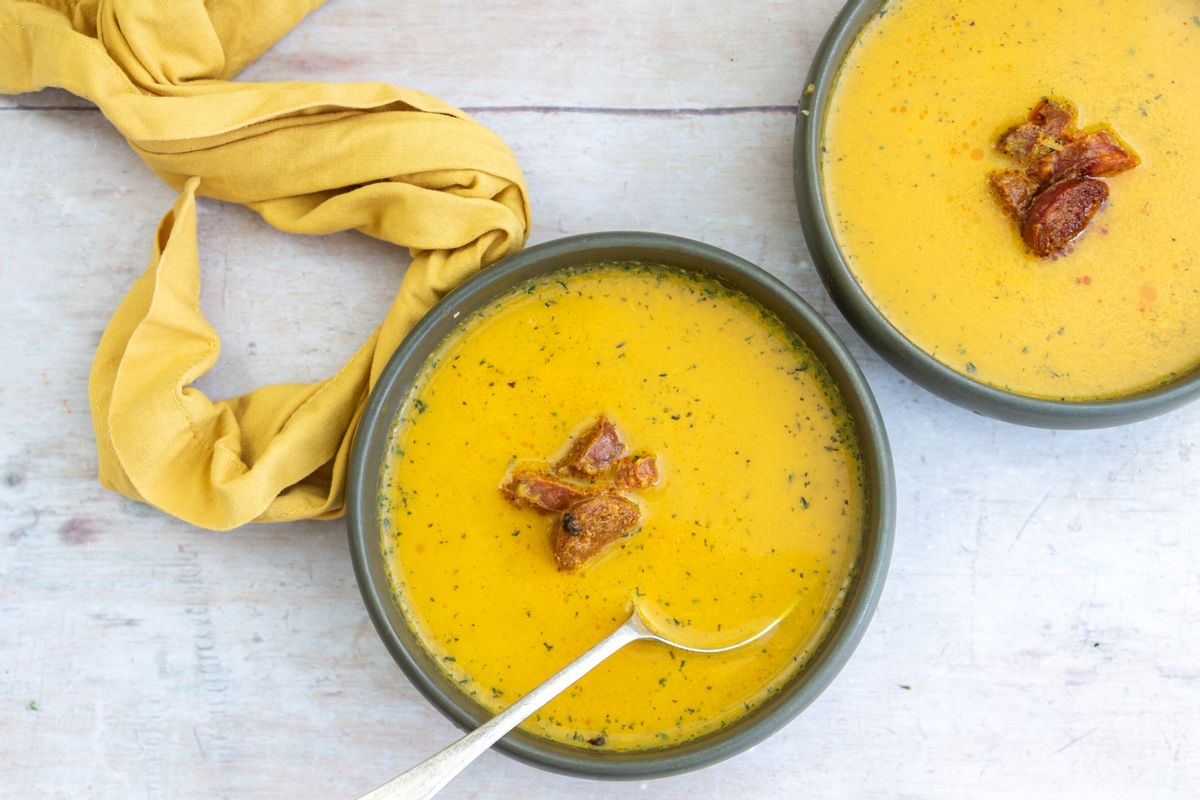 Once the squash is tender, you can blend the soup. Remove from the heat and use a handheld stick blender to carefully blend the soup until smooth. Alternatively, allow the soup to cool a little, transfer to a free-standing blender, and purée until smooth. Divide the soup between 4 individual serving bowls. Top each bowl with the pan-fried chorizo slices. Serve the soup hot with your preferred sides.