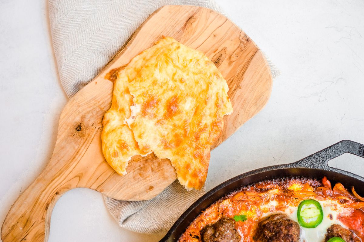 Keto naan bread will be your new favorite way to soak up sauces to any dish. Soft and fluffy, this naan bread is a crowd-pleaser that is very easy to make. Keto Naan dough made with a mixture of shredded Chihuahua cheese, coconut flour, and an egg that is melted in the microwave and then spread on a Silpat. The recipe makes one naan bread, but it can easily be doubled to make more. If increasing batch sizes, it would be best to stick with only doubling the recipe because the finished dough will cool quickly and not spread as easily.