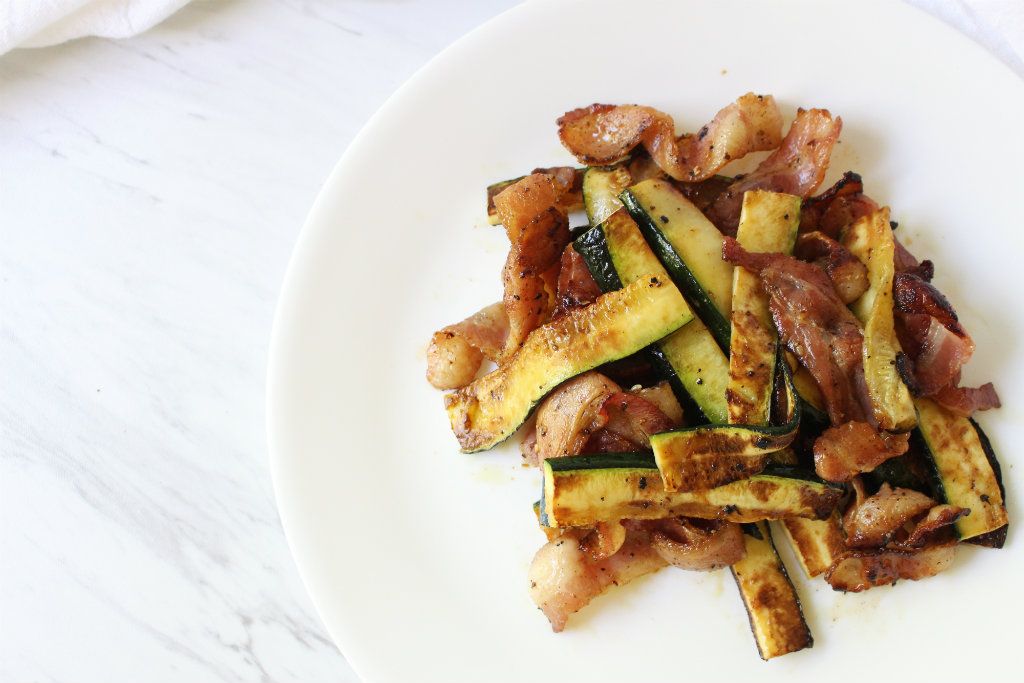 This side is a simple way to add fat to your meal without making the meal too rich tasting. Crispy bacon is tossed with lightly seasoned zucchini. The natural sodium from the bacon and its grease keep the side dish salty with having to add extra seasoning.