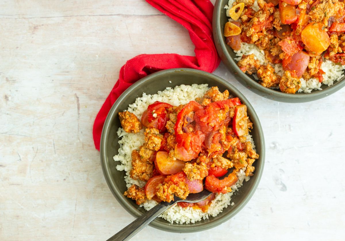 Divide the cauliflower rice between four individual serving bowls. Top the rice with the turkey mixture. Serve hot.