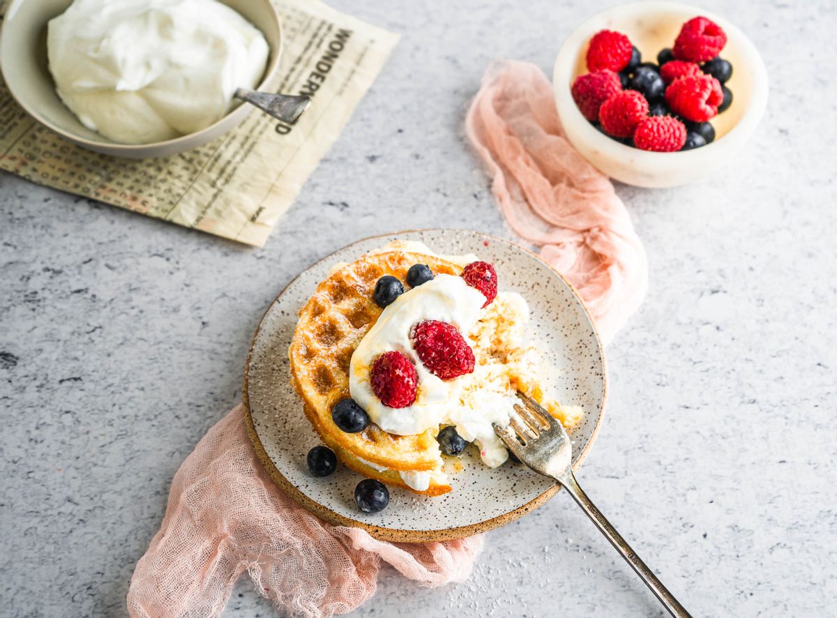 Top each waffle with some whipped cream and berries. Serve immediately.