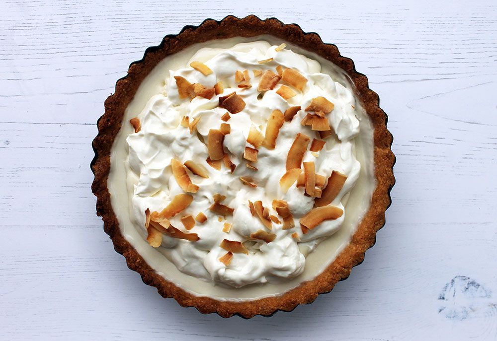 Remove the set custard tart from the fridge and spoon over the whipped coconut cream cheese. Scatter with toasted coconut chips to serve.