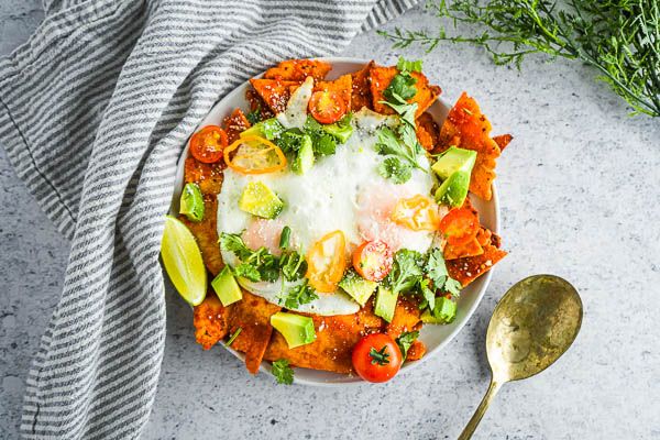 Chilaquiles can be served with many toppings. You can use many of the toppings used for tacos on chilaquiles like shredded meat (pork, beef, or chicken), sour cream, cilantro, pico de gallo, guacamole, cheeses (cotija, queso fresco, Chihuahua, or a shredded Mexican blend). Fresh avocados make an ultimate dish and help to add healthy, satiating fats. I like to place bowls of toppings on the table so guests can top their dish with whatever toppings they would like.