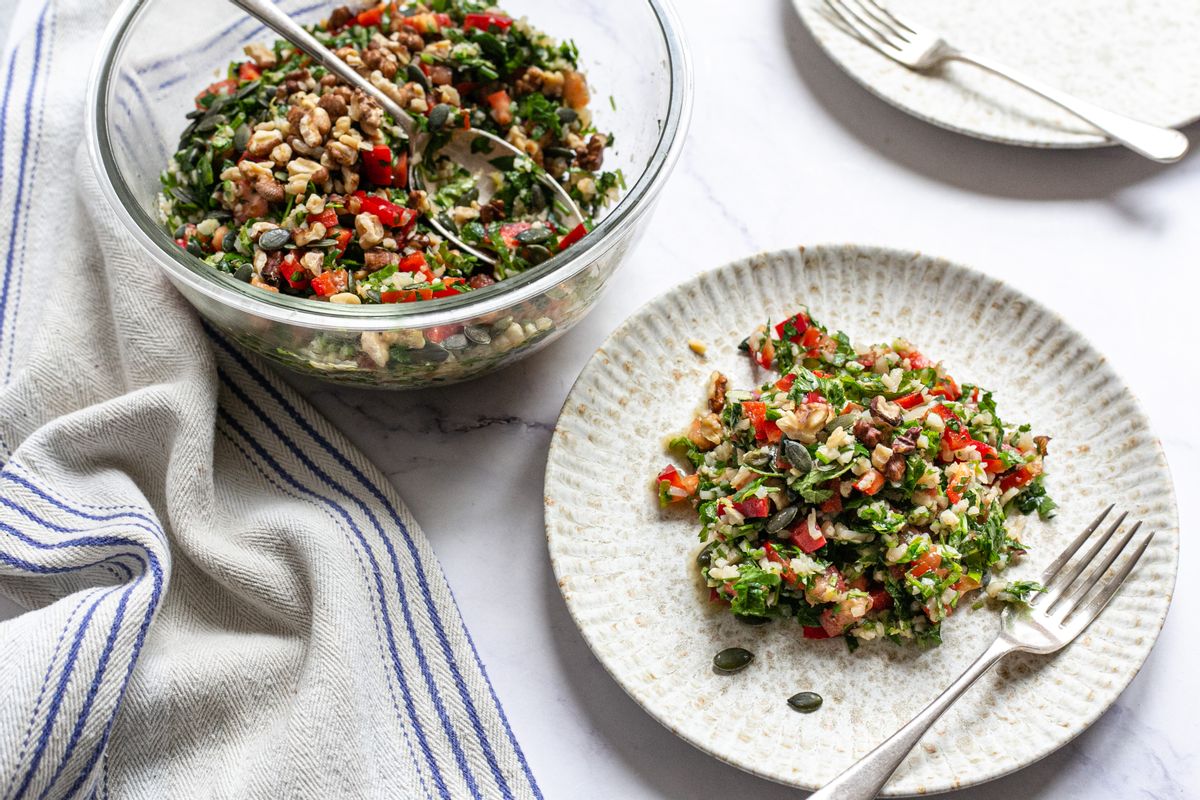 Gently toss to combine all the ingredients together. Drizzle the olive oil and lemon juice over the tabbouleh, season to taste, and give a final stir with a metal spoon. Sprinkle the pumpkin seeds and walnuts over the top before serving.