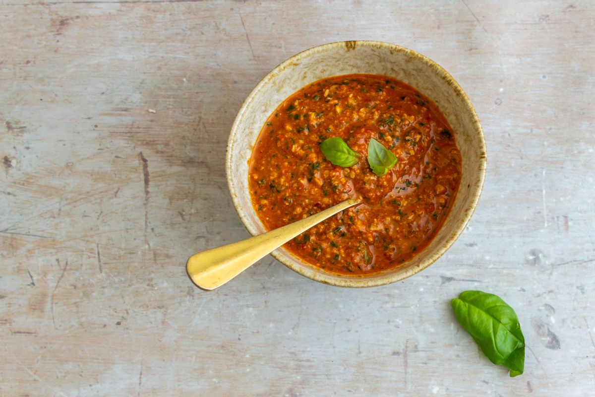 This Keto sauce recipe is our twist on a classic pesto. Our spicy Keto pesto is prepared with roasted red bell peppers, aromatic fresh basil, crunchy pine nuts, fragrant garlic, a hint of lemon, tangy parmesan cheese, and fiery dried chili flakes. The ingredients are combined in a food processor to form a coarse paste, then blended with olive oil to create a semi-smooth pesto sauce.