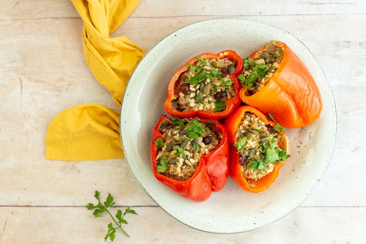 These delicious slow-cooked peppers make a great Thanksgiving Keto recipe, perfect for the holidays. Our juicy Keto crockpot peppers are stuffed with ground turkey, tender cauliflower rice, aromatic herbs, and sweet cranberries. The peppers are then topped with crunchy seeds to serve. This makes an easy lunch option for the festive season.
