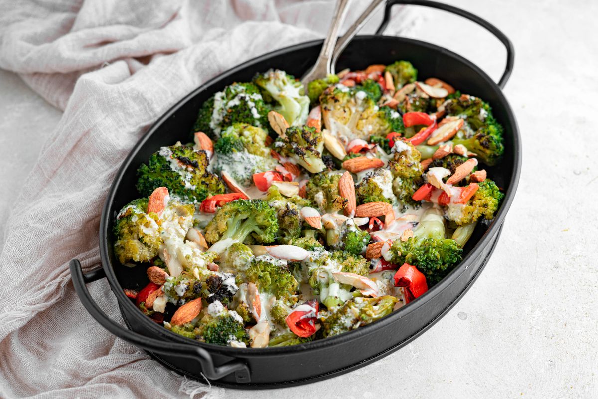 The Keto roasted broccoli salad is one of the easiest side dishes to prepare. Bake the broccoli florets and bell peppers on high for 15-20 minutes until they become slightly charred. The dressing takes 3 minutes to prepare by whisking together tahini, lemon juice, and olive oil. This salad is best prepared right before serving, as it is most delicious when warm.