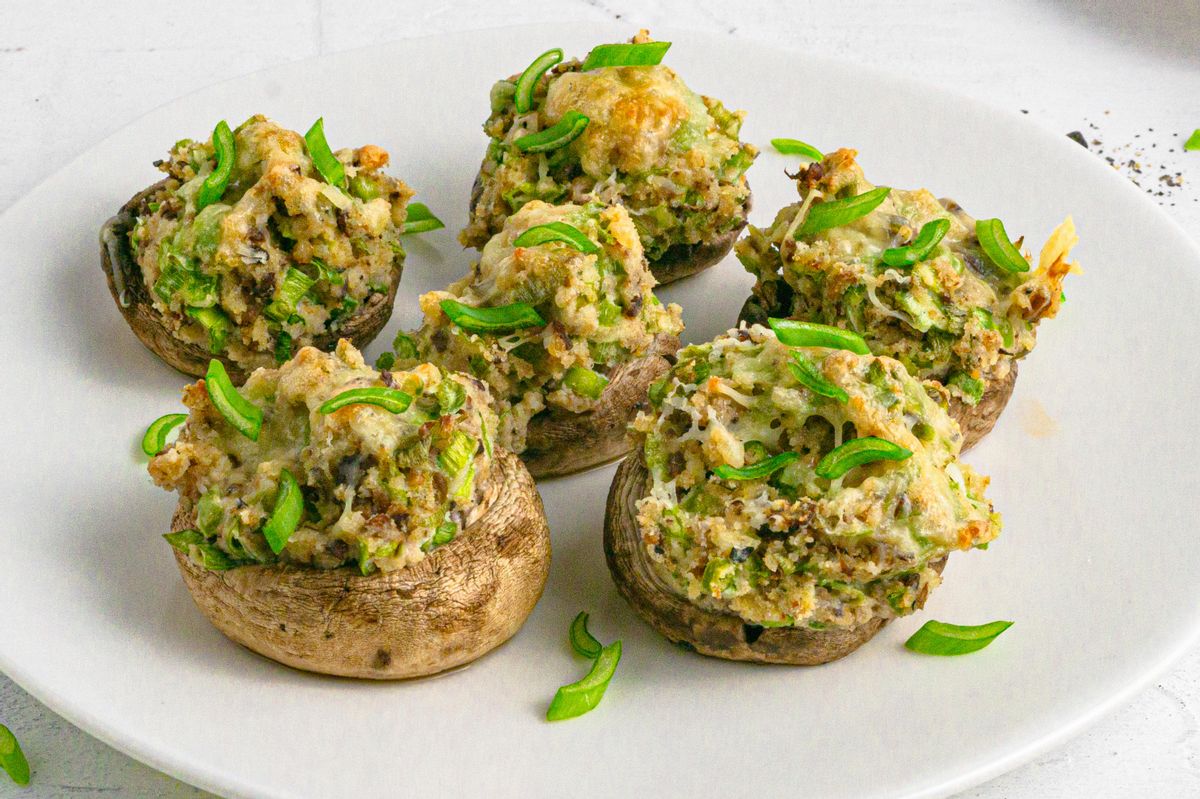 Bake for 20-25 minutes or until the mushroom tops become golden and the mushrooms reach a tender consistency. Garnish with finely chopped scallions.