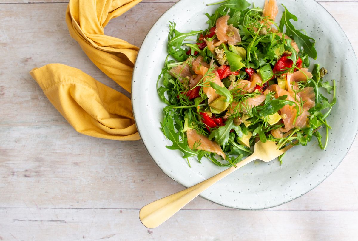 This easy Keto salad recipe is rich with healthy fats and low carb veggies. Our simple Keto salad is layered with peppery arugula, sweet roasted bell pepper, creamy avocado, tender smoked salmon, salty capers, and a scattering of fresh dill. The salad is dressed with a simple lemon and olive oil dressing to serve. Perfect for a low carb lunch or light Keto dinner option.