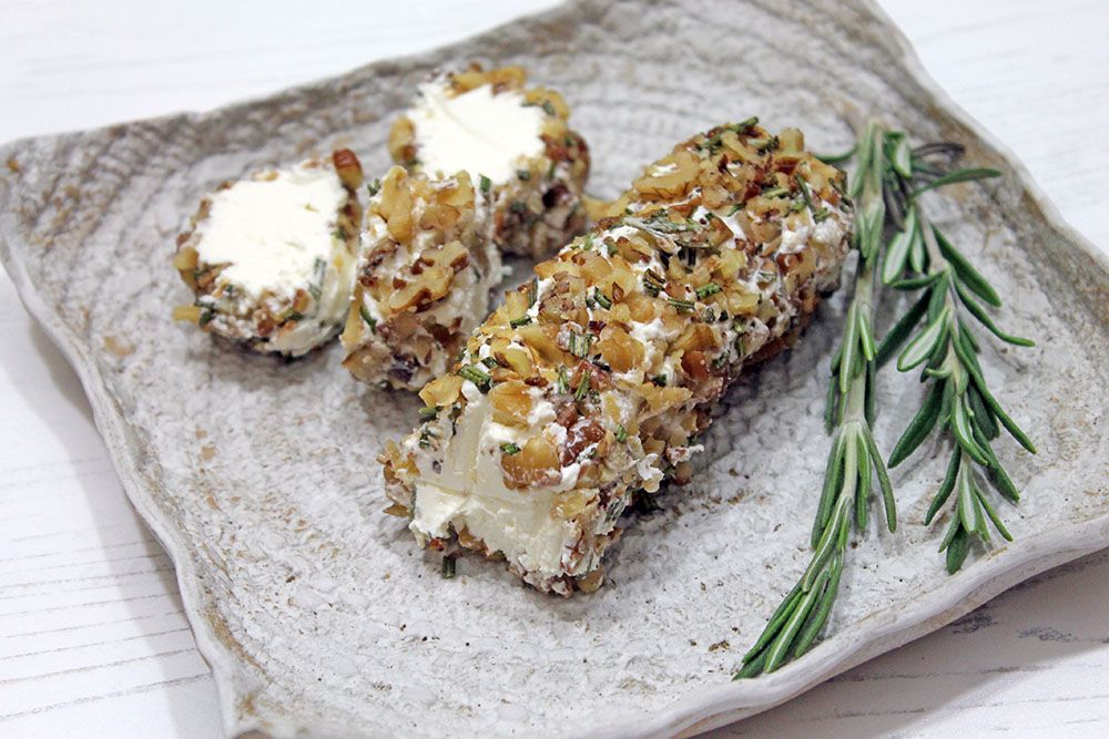 This delicious cheese log has a perfectly smooth and creamy center with a crunchy coating of candied nuts.