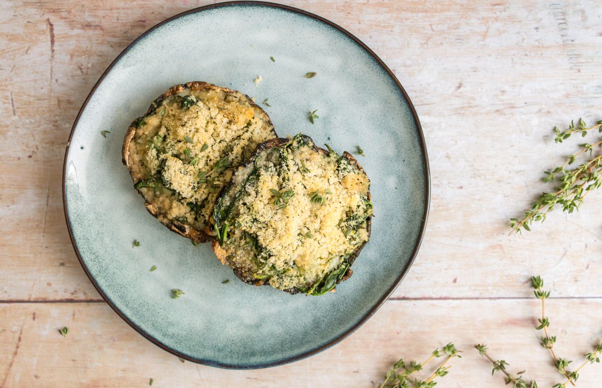 These stuffed portobello mushrooms are loaded with a layer of oozy mozzarella, buttery wilted spinach and garlic and topped with a golden almond, parmesan and herb crumb.