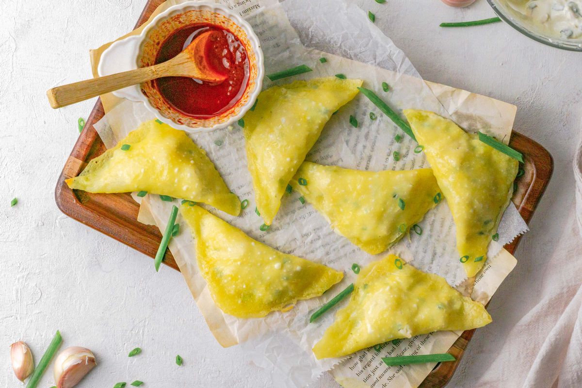 In a bowl, mix cream cheese, crab meat, scallion, soy sauce, and garlic powder. Put a spoonful of mixture on each cheese slice and then fold in half on a diagonal.Step 3