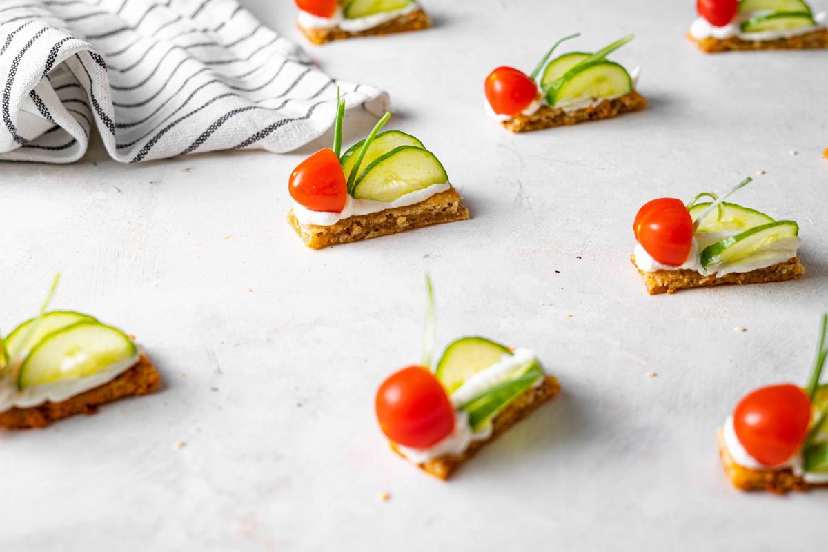 These crackers are rich, flavorful, and crunchy. They consist of almond meal, mozzarella cheese, butter, egg white, and seasoning. These ingredients are pulsed in a food processor until a wet dough forms. The dough is then chilled, rolled, sliced, and baked into small rectangles. After they cool, they are ready to be decorated.