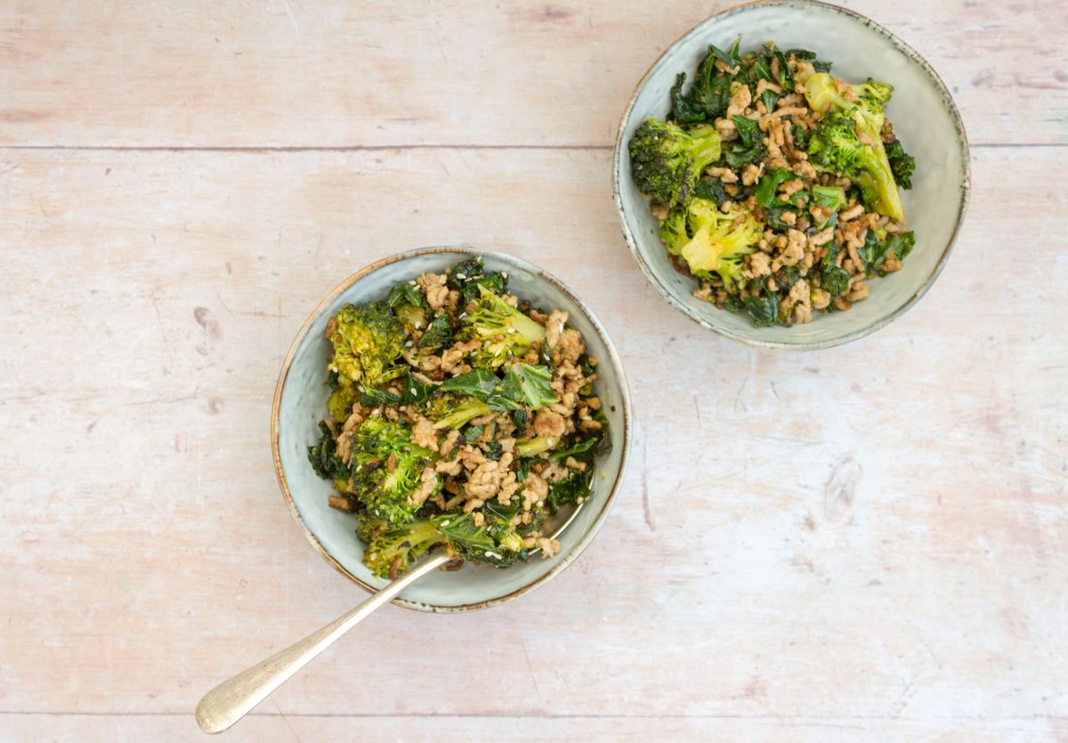 This keto stir fry is loaded with ground pork, tender kale and crisp broccoli, tossed with sesame seeds, sesame oil and zesty lemon.